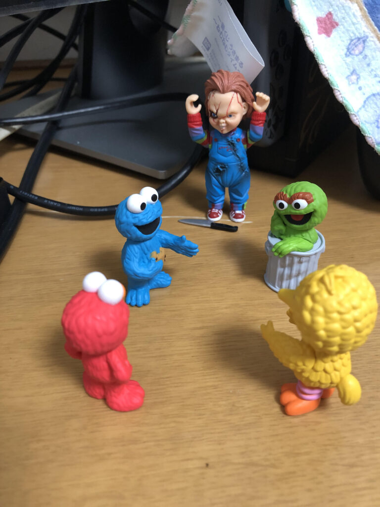 ↑これはセサミキャラ達がチャッキーをハブってる様子ですね。