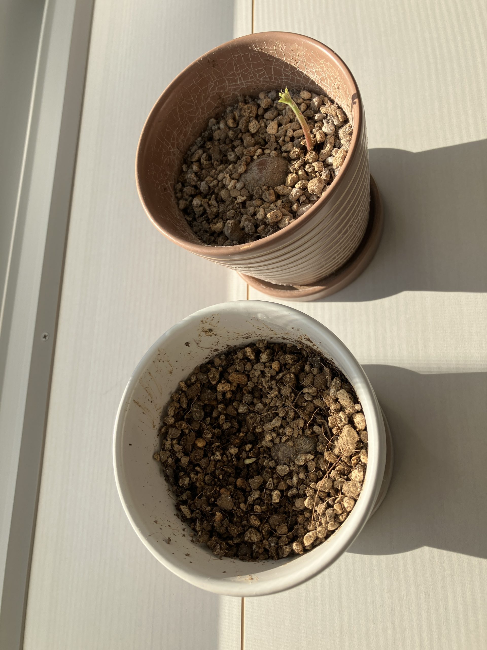 どんぐり育成日記#?日目 日記 2025.02.09 こんにちは、サソです。 どんぐりを育てて(主に旦那さん)どのくらいになるでしょうか。 全く期待していませんでしたが芽が出ました。 茶色い鉢が旦那さんの方。 芽が伸びて、葉っぱまで出てきてます。 私の白い鉢はというと 伸びてはいませんが土の中にいるみたいです! 変なことろから芽が出たのか、まだ土に埋もれていますが2つとも発芽してよかったです。 完全に芽を出したらまた報告します。